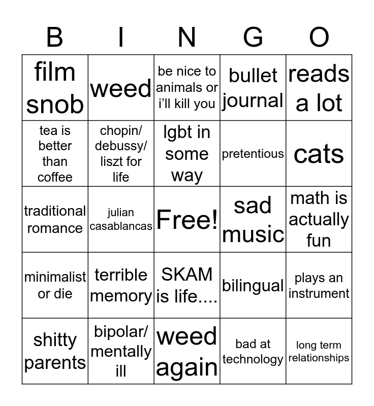 This bingo card has a free space and 24 words: terrible memory, bipolar/ mentally ill, lgbt in some way, shitty parents, reads a lot, film snob, tea is better than coffee, weed, sad music, SKAM is life...., pretentious, traditional romance, bilingual, plays an instrument, chopin/ debussy/ liszt for life, bad at technology, math is actually fun, be nice to animals or i’ll kill you, cats, julian casablancas, long term relationships, minimalist or die, bullet journal and weed again.