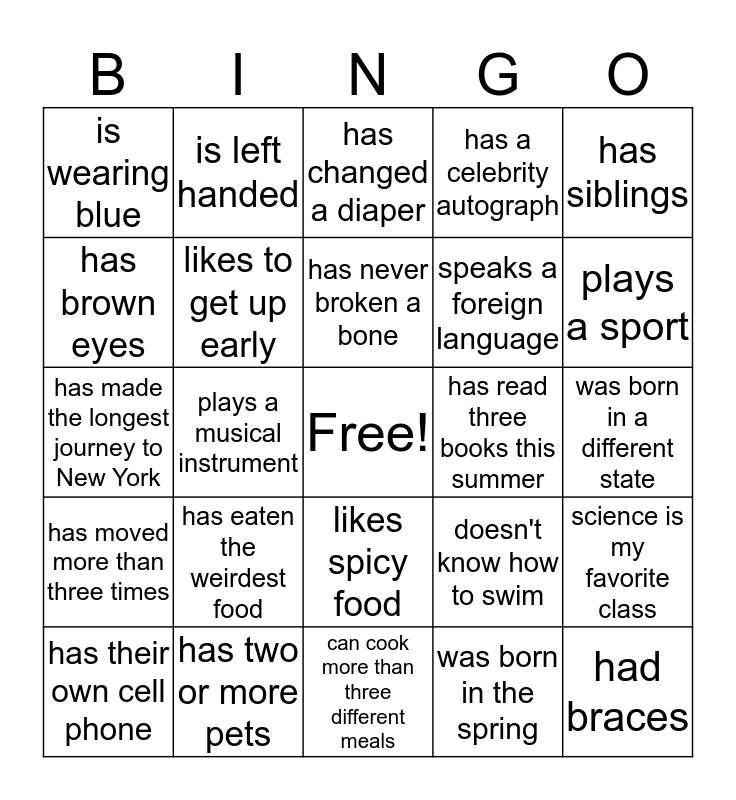 This bingo card has a free space and 24 words: has eaten the weirdest food, has two or more pets, has never broken a bone, has their own cell phone, has siblings, is wearing blue, has brown eyes, is left handed, has read three books this summer, likes spicy food, speaks a foreign language, has made the longest journey to New York, doesn't know how to swim, science is my favorite class, likes to get up early, was born in the spring, was born in a different state, has changed a diaper, plays a sport, plays a musical instrument, had braces, has moved more than three times, has a celebrity autograph and can cook more than three different meals.