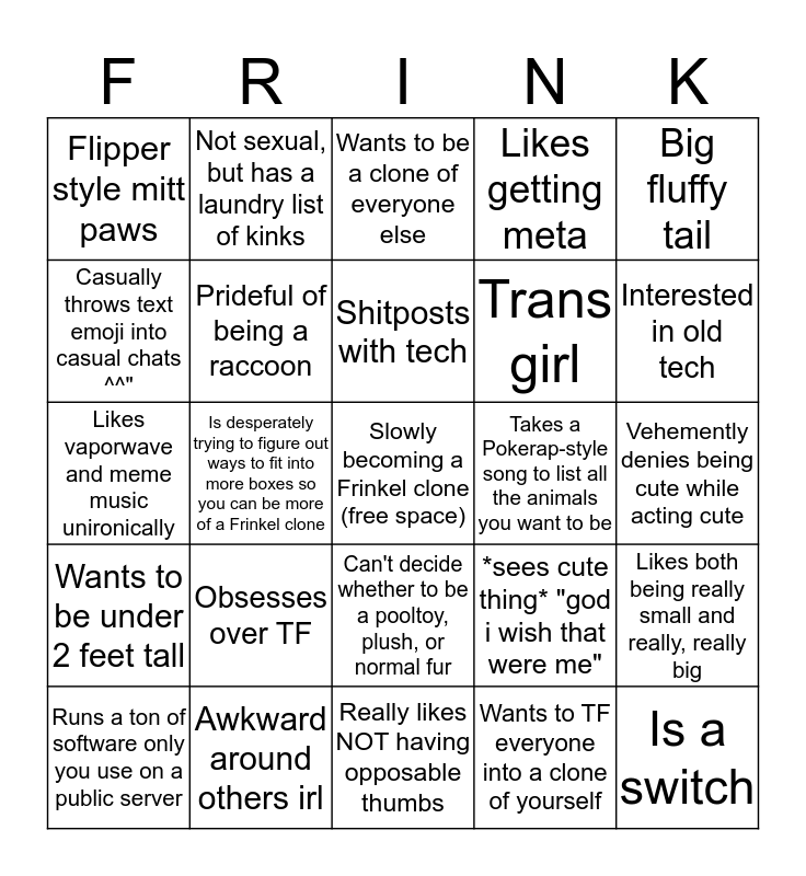 This bingo card has a free space and 24 words: Obsesses over TF, Awkward around others irl, Shitposts with tech, Runs a ton of software only you use on a public server, Big fluffy tail, Flipper style mitt paws, Casually throws text emoji into casual chats ^^", Not sexual, but has a laundry list of kinks, Takes a Pokerap-style song to list all the animals you want to be, Can't decide whether to be a pooltoy, plush, or normal fur, Trans girl, Likes vaporwave and meme music unironically, *sees cute thing* "god i wish that were me", Likes both being really small and really, really big, Prideful of being a raccoon, Wants to TF everyone into a clone of yourself, Vehemently denies being cute while acting cute, Wants to be a clone of everyone else, Interested in old tech, Is desperately trying to figure out ways to fit into more boxes so you can be more of a Frinkel clone, Is a switch, Wants to be under 2 feet tall, Likes getting meta and Really likes NOT having opposable thumbs.