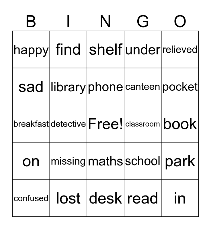 This bingo card has a free space and 24 words: missing, lost, phone, confused, relieved, happy, sad, find, classroom, maths, canteen, breakfast, school, park, library, read, book, shelf, pocket, detective, in, on, under and desk.