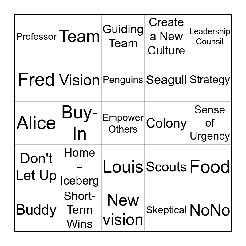 This bingo card has 25 words: Home = Iceberg, New vision, Penguins, Buddy, Leadership Counsil, Professor, Fred, Team, Colony, Louis, Seagull, Alice, Scouts, Food, Vision, NoNo, Sense of Urgency, Guiding Team, Strategy, Buy-In, Empower Others, Short-Term Wins, Don't Let Up, Create a New Culture and Skeptical.
