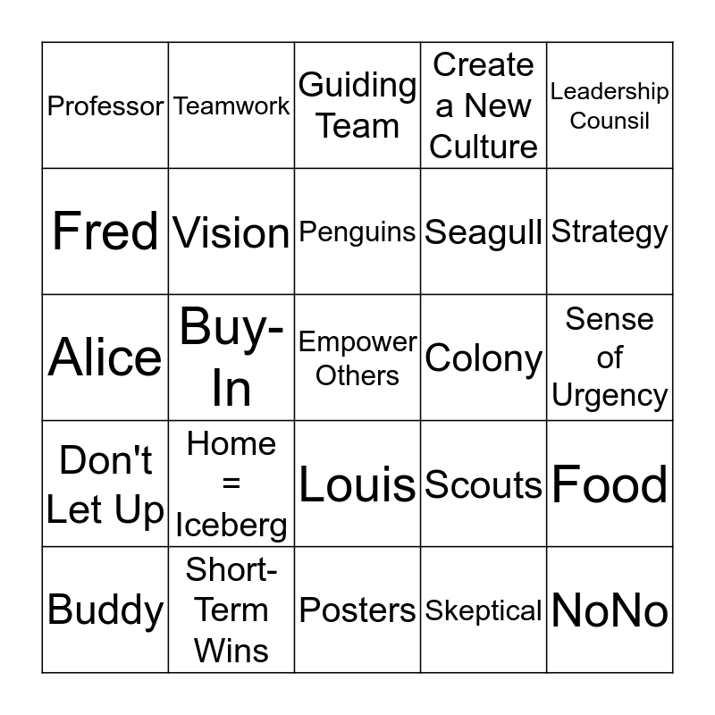 This bingo card has 25 words: Home = Iceberg, Posters, Penguins, Buddy, Leadership Counsil, Professor, Fred, Teamwork, Colony, Louis, Seagull, Alice, Scouts, Food, Vision, NoNo, Sense of Urgency, Guiding Team, Strategy, Buy-In, Empower Others, Short-Term Wins, Don't Let Up, Create a New Culture and Skeptical.