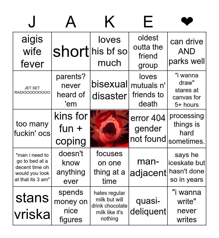 This bingo card has a free space and 24 words: doesn't know anything ever, spends money on nice figures, bisexual disaster, stans vriska, can drive AND parks well, aigis wife fever, JET SET RADIOOOOOOOOO, short, error 404 gender not found, focuses on one thing at a time, loves mutuals n' friends to death, too many fuckin' ocs, man-adjacent, says he iceskate but hasn't done so in years, parents? never heard of 'em, quasi-deliquent, processing things is hard sometimes., loves his bf so much, "i wanna draw" stares at canvas for 5+ hours, kins for fun + coping, "i wanna write" never writes, "man i need to go to bed at a decent time oh would you look at that its 3 am", oldest outta the friend group and hates regular milk but will drink chocolate milk like it's nothing.
