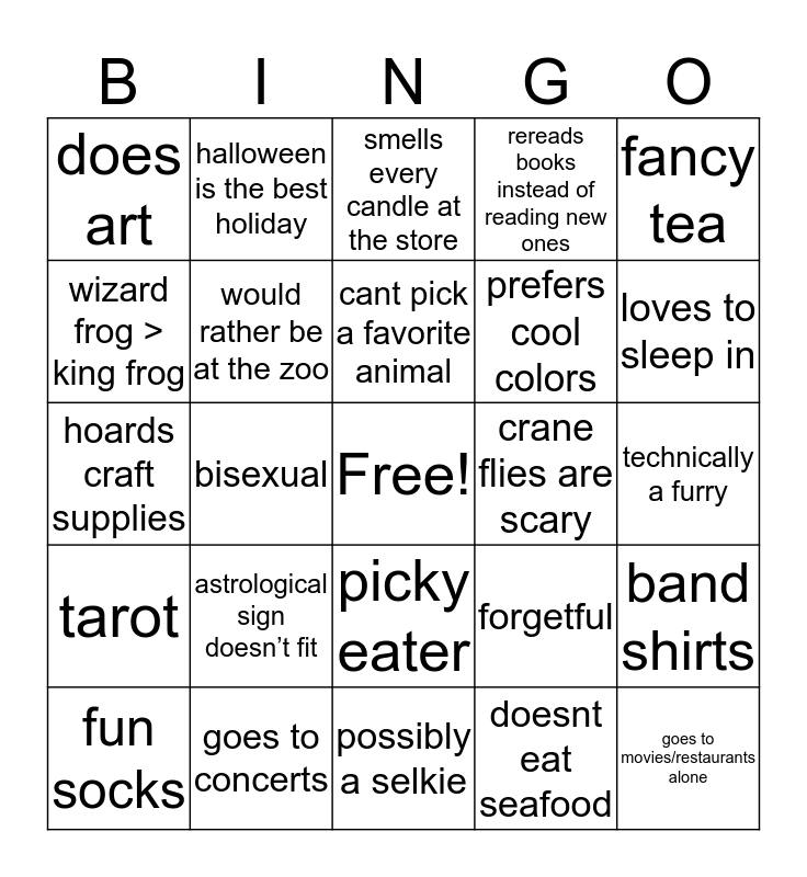 This bingo card has a free space and 25 words: tarot, goes to concerts, possibly a selkie, doesnt eat seafood, fancy tea, does art, halloween is the best holiday, smells every candle at the store, crane flies are scary, band shirts, wizard frog > king frog, would rather be at the zoo, Free!, forgetful, loves to sleep in, fun socks, bisexual, cant pick a favorite animal, prefers cool colors, technically a furry, hoards craft supplies, astrological sign doesn’t fit, picky eater, rereads books instead of reading new ones and goes to movies/restaurants alone.
