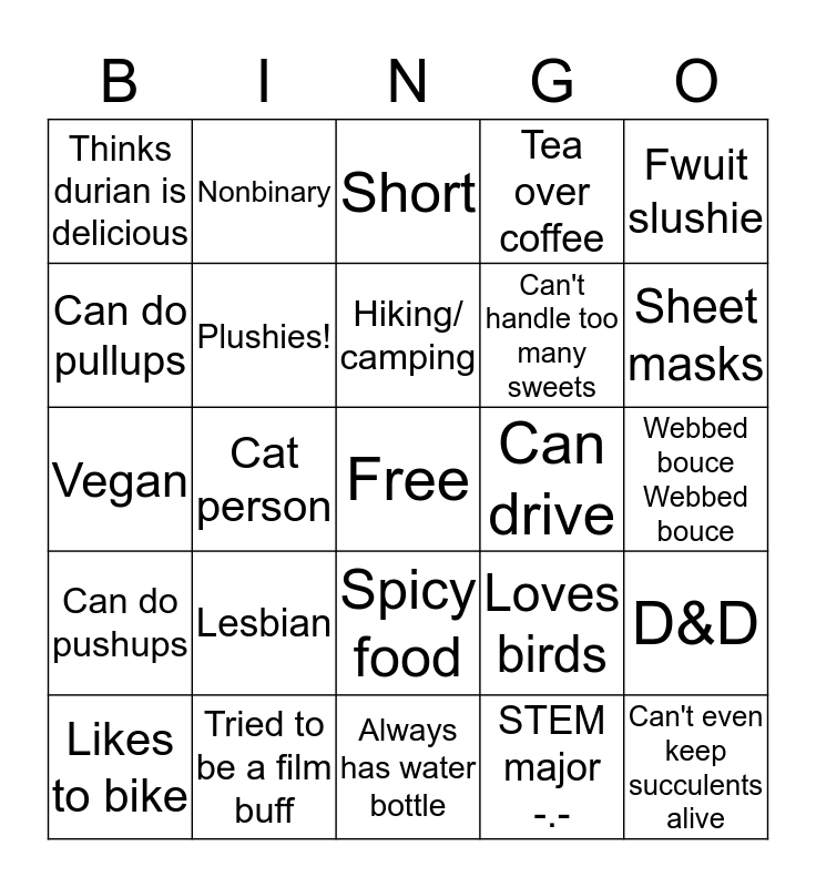 This bingo card has a free space and 24 words: Lesbian, Tried to be a film buff, Hiking/ camping, Likes to bike, Fwuit slushie, Thinks durian is delicious, Can do pullups, Nonbinary, Can drive, Spicy food, Can't handle too many sweets, Vegan, Loves birds, D&D, Plushies!, STEM major -.-, Webbed bouce Webbed bouce, Short, Sheet masks, Cat person, Can't even keep succulents alive, Can do pushups, Tea over coffee and Always has water bottle.