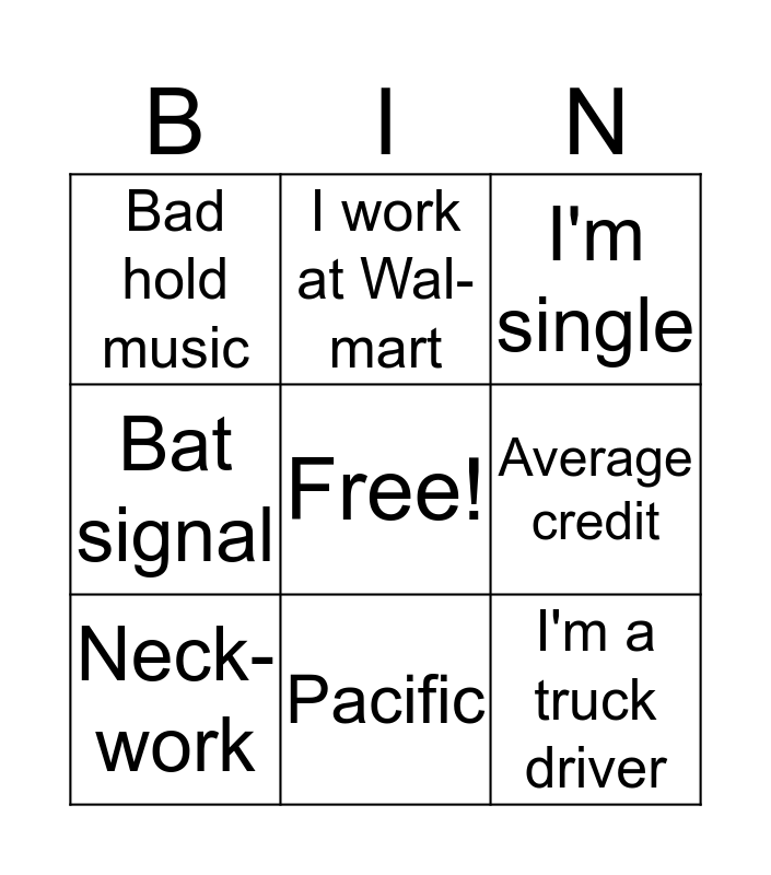 This bingo card has a free space and 8 words: Average credit, I'm single, I work at Wal-mart, Neck-work, Bad hold music, I'm a truck driver, Bat signal and Pacific.