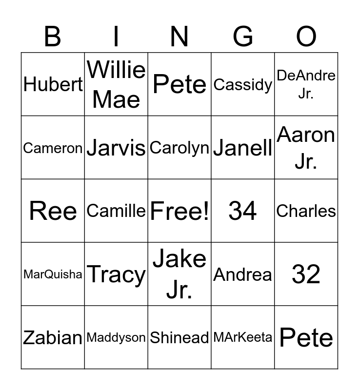 This bingo card has a free space and 24 words: Tracy, Maddyson, Carolyn, Zabian, DeAndre Jr., Hubert, Cameron, Willie Mae, 34, Jake Jr., Janell, Ree, Andrea, 32, Jarvis, MArKeeta, Charles, Pete, Aaron Jr., Camille, Pete, MarQuisha, Cassidy and Shinead.