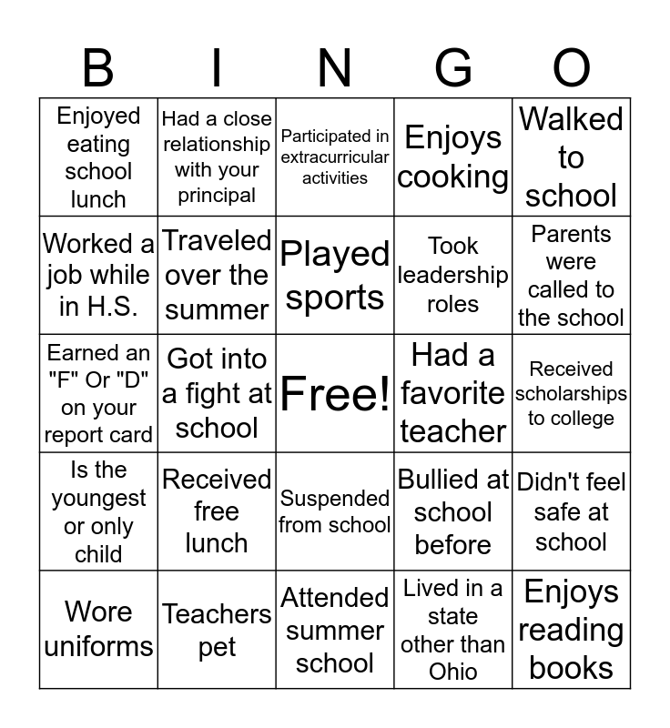 This bingo card has a free space and 24 words: Received free lunch, Teachers pet, Played sports, Wore uniforms, Walked to school, Enjoyed eating school lunch, Worked a job while in H.S., Had a close relationship with your principal, Had a favorite teacher, Suspended from school, Took leadership roles, Earned an "F" Or "D" on your report card, Bullied at school before, Didn't feel safe at school, Traveled over the summer, Lived in a state other than Ohio, Received scholarships to college, Participated in extracurricular activities, Parents were called to the school, Got into a fight at school, Enjoys reading books, Is the youngest or only child, Enjoys cooking and Attended summer school.