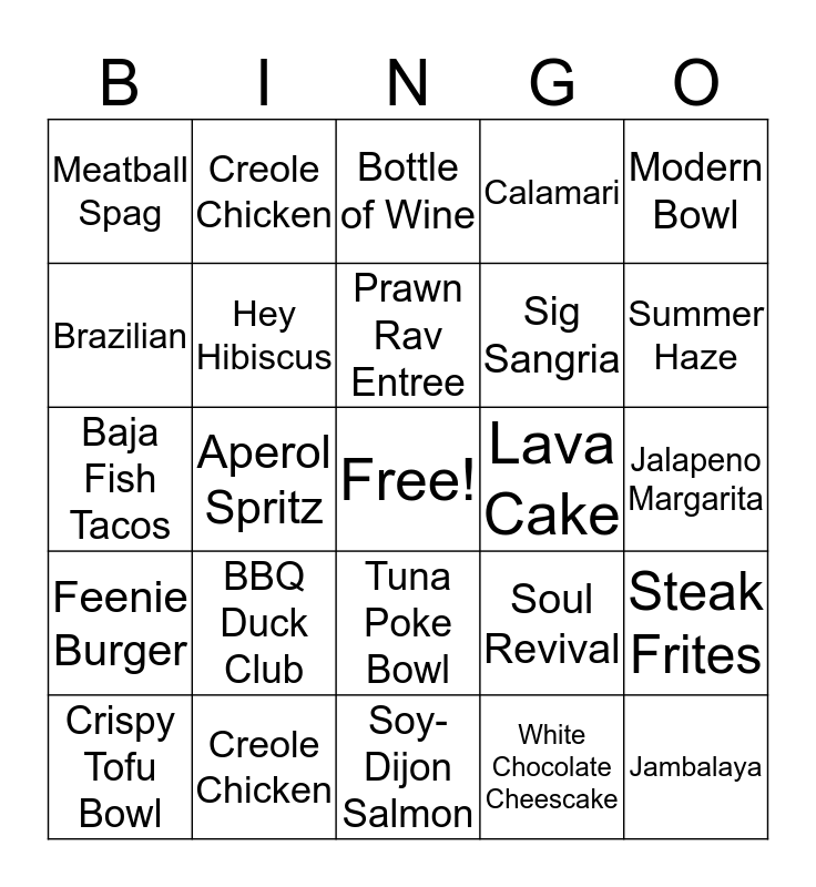 This bingo card has a free space and 31 words: Soy-Dijon Salmon, Millionaire, Aperol Spritz, Frose Sangria, Meatball Spag, Bottle of Wine, Hey Hibiscus, Soul Revival, Lava Cake, White Chocolate Cheescake, Jalapeno Margarita, Jambalaya, Rocket Salad, Hunter Chicken, Summer Haze, Texas Mule, Steak Frites, BBQ Duck Club, Feenie Burger, Tuna Poke Bowl, Modern Bowl, Teriyaki Bowl, Crispy Tofu Bowl, Creole Chicken, Sig Sangria, Brazilian, Calamari, Baja Fish Tacos, Creole Chicken, Prawn Rav Entree and Prawn Spag.