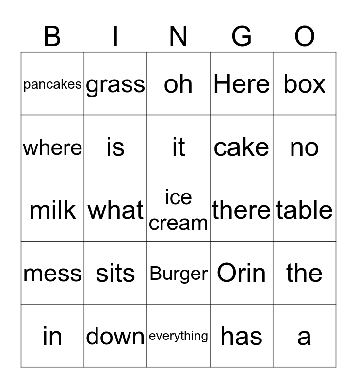 This bingo card has a free space and 24 words: sits, down, it, in, box, pancakes, where, grass, there, Burger, cake, milk, Orin, the, is, has, table, oh, no, what, a, mess, Here and everything.
