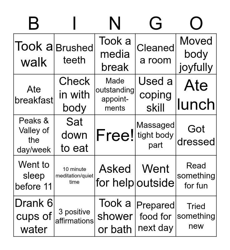 This bingo card has a free space and 24 words: 10 minute meditation/quiet time, 3 positive affirmations, Made outstanding appoint-ments, Drank 6 cups of water, Moved body joyfully, Took a walk, Ate breakfast, Brushed teeth, Massaged tight body part, Asked for help, Used a coping skill, Peaks & Valley of the day/week, Went outside, Read something for fun, Check in with body, Prepared food for next day, Got dressed, Took a media break, Ate lunch, Sat down to eat, Tried something new, Went to sleep before 11, Cleaned a room and Took a shower or bath.