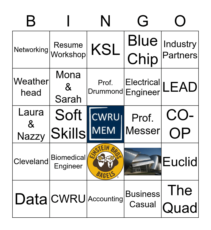 This bingo card has 2 images, a free space and 24 words: Business Casual, Prof. Drummond, CWRU, Industry Partners, Networking, Weather head, Resume Workshop, CO-OP, Electrical Engineer, Laura & Nazzy, Euclid, Data, Soft Skills, Nord 356, Blue Chip, Cleveland, KSL, The Quad, LEAD, Accounting, Prof. Messer, Biomedical Engineer, Mona & Sarah and Chemical Engineer.