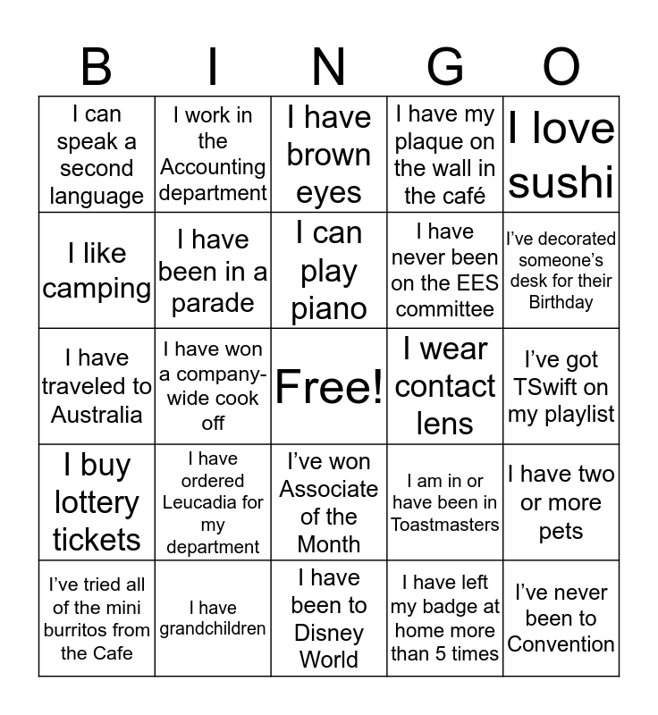 This bingo card has a free space and 24 words: I have ordered Leucadia for my department, I have grandchildren, I can play piano, I’ve tried all of the mini burritos from the Cafe, I love sushi, I can speak a second language, I like camping, I work in the Accounting department, I wear contact lens, I’ve won Associate of the Month, I have never been on the EES committee, I have traveled to Australia, I am in or have been in Toastmasters, I have two or more pets, I have been in a parade, I have left my badge at home more than 5 times, I’ve got TSwift on my playlist, I have brown eyes, I’ve decorated someone’s desk for their Birthday, I have won a company-wide cook off, I’ve never been to Convention, I buy lottery tickets, I have my plaque on the wall in the café and I have been to Disney World.
