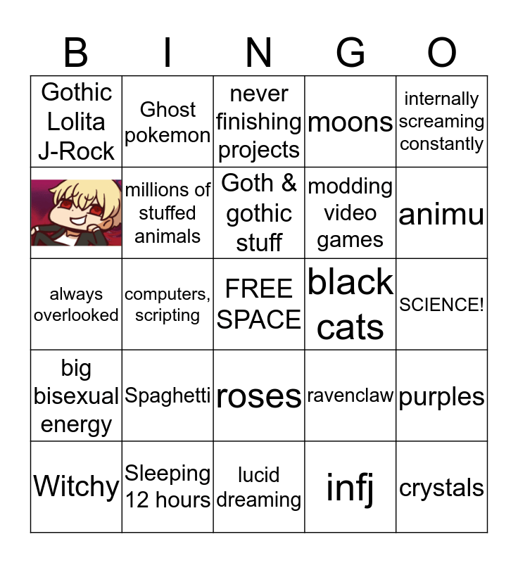 This bingo card has 1 images, a free space and 23 words: Spaghetti, Sleeping 12 hours, Goth & gothic stuff, Witchy, internally screaming constantly, Gothic Lolita J-Rock, Ghost pokemon, black cats, roses, modding video games, always overlooked, ravenclaw, purples, millions of stuffed animals, infj, SCIENCE!, never finishing projects, animu, computers, scripting, crystals, big bisexual energy, moons and lucid dreaming.