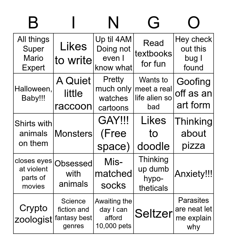 This bingo card has a free space and 24 words: Obsessed with animals, Science fiction and fantasy best genres, Pretty much only watches cartoons, Crypto zoologist, Hey check out this bug I found, All things Super Mario Expert, Halloween, Baby!!!, Likes to write, Likes to doodle, Mis-matched socks, Wants to meet a real life alien so bad, Shirts with animals on them, Thinking up dumb hypo-theticals, Anxiety!!!, A Quiet little raccoon, Seltzer, Thinking about pizza, Up til 4AM Doing not even I know what, Goofing off as an art form, Monsters, Parasites are neat let me explain why, closes eyes at violent parts of movies, Read textbooks for fun and Awaiting the day I can afford 10,000 pets.