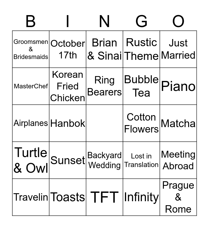 This bingo card has a free space and 40 words: Jar Message Quotes, Airplanes, Flower Girls, Korean Fried Chicken, Toasts, Backyard Wedding, Ring Bearers, String Lights, Just Married, Turtle & Owl, Hanbok, Rustic Theme, Prague & Rome, Matcha, Cotton Flowers, Sunset, Older Sisters, Groomsmen & Bridesmaids, Hostel, Brian & Sinai, Meeting Abroad, Infinity, Bubble Tea, MasterChef, Sevilla, Candles, Holding Hands, Twine, Burlap, Together Fur Real, Shamatiru 4 The World, Travelin, August 10th, Lost in Translation, Piano, TFT, Peluches, Maria Luisa Park, October 17th and Jum!.