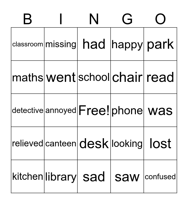 This bingo card has a free space and 24 words: canteen, library, school, kitchen, park, classroom, maths, missing, phone, desk, chair, detective, looking, lost, went, saw, was, had, read, annoyed, confused, relieved, happy and sad.