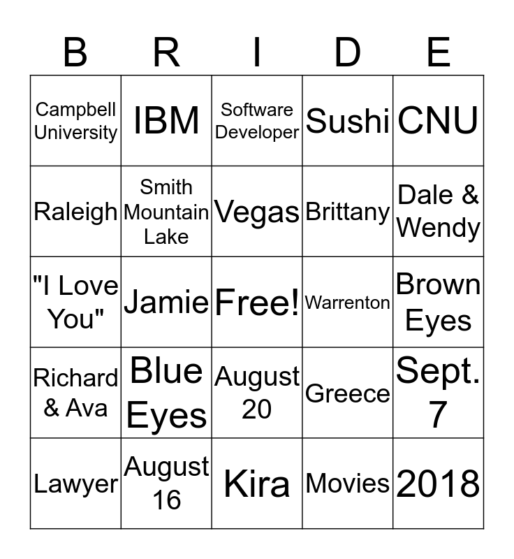 This bingo card has a free space and 30 words: August 16, Brownies, Jamie, 2015, Campbell University, Software Developer, Smith Mountain Lake, August 20, Warrenton, Kira, Brown Eyes, 2018, Movies, Richmond, Dale & Wendy, Pooh Bear, Greece, Richard & Ava, Blue Eyes, CNU, "I Love You", 2014, IBM, Brittany, Raleigh, Sushi, Sept. 7, Lawyer, Vegas and John.