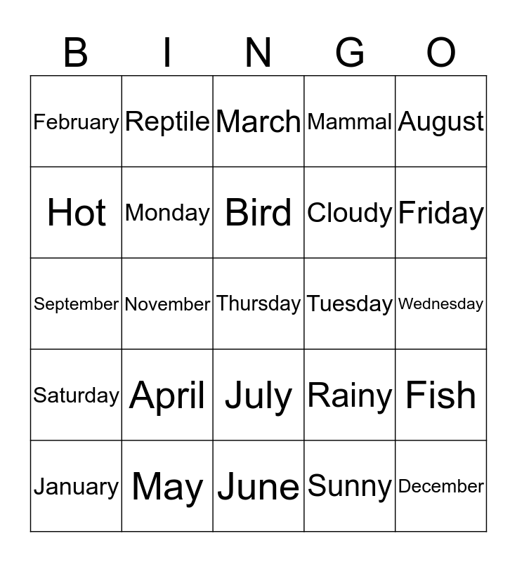This bingo card has a free space and 29 words: January, October, November, Cold, February, March, Monday, April, Tuesday, May, Wednesday, December, June, Sunny, Friday, Windy, July, Saturday, August, September, Rainy, Sunday, Cloudy, Hot, Mammal, Reptile, Fish, Bird and Amphibian.