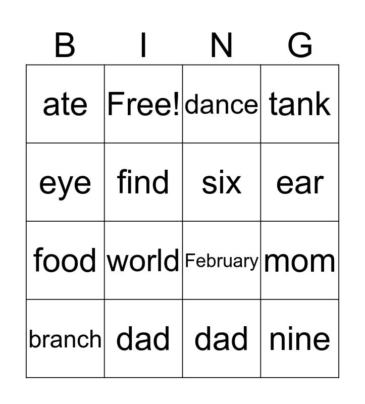 This bingo card has 32 words: room, bed, mom, sing, nine, six, eye, frog, Free!, hand, ear, dance, eight, friends, dad, flower, January, February, April, August, September, October, dad, sister, branch, tank, food, find, ate, crocodile, magic and world.