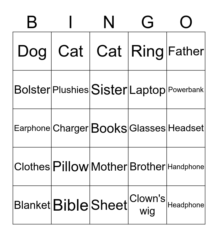 This bingo card has 25 words: Pillow, Sheet, Sister, Blanket, Father, Dog, Bolster, Cat, Glasses, Mother, Laptop, Earphone, Brother, Handphone, Plushies, Headphone, Headset, Cat, Powerbank, Charger, Books, Bible, Clothes, Ring and Clown's wig.