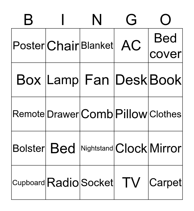 This bingo card has a free space and 24 words: Bed, Radio, Fan, Cupboard, Bed cover, Poster, Box, Chair, Pillow, Nightstand, Desk, Remote, Clock, Mirror, Lamp, TV, Clothes, Blanket, Book, Drawer, Carpet, Bolster, AC and Socket.
