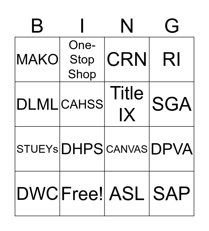 This bingo card has 21 words: Free!, Degree Works, One-Stop Shop, DTUC, ASL, Title IX, MAKO, CRN, CANVAS, SGA, STUEYs, RI, SAP, Degree App, CAHSS, DFT, DWC, DHPS, DLML, DPVA and DMS.