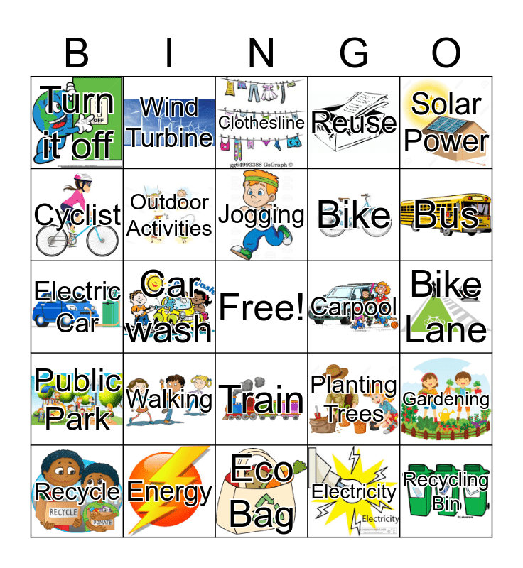 This bingo card has 24 images, a free space and 24 words: Walking, Energy, Jogging, Recycle, Solar Power, Turn it off, Cyclist, Wind Turbine, Carpool, Train, Bike, Electric Car, Planting Trees, Gardening, Outdoor Activities, Electricity, Bike Lane, Clothesline, Bus, Car wash, Recycling Bin, Public Park, Reuse and Eco Bag.