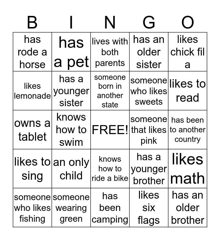 This bingo card has a free space and 24 words: an only child, someone wearing green, someone born in another state, someone who likes fishing, likes chick fil a, has rode a horse, likes lemonade, has a pet, someone that likes pink, knows how to ride a bike, someone who likes sweets, owns a tablet, has a younger brother, likes math, has a younger sister, likes six flags, has been to another country, lives with both parents, likes to read, knows how to swim, has an older brother, likes to sing, has an older sister and has been camping.
