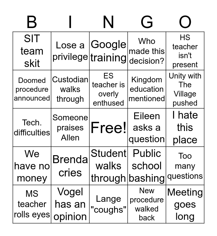 This bingo card has a free space and 24 words: Brenda cries, Vogel has an opinion, ES teacher is overly enthused, MS teacher rolls eyes, HS teacher isn't present, SIT team skit, Doomed procedure announced, Lose a privilege, Eileen asks a question, Student walks through, Kingdom education mentioned, Tech. difficulties, Public school bashing, Too many questions, Custodian walks through, New procedure walked back, I hate this place, Google training, Unity with The Village pushed, Someone praises Allen, Meeting goes long, We have no money, Who made this decision? and Lange "coughs".