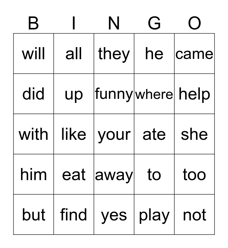 This bingo card has a free space and 24 words: eat, find, funny, but, came, will, did, all, ate, away, where, with, to, too, up, play, she, they, help, like, not, him, he and yes.
