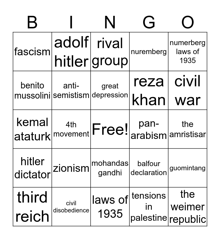 This bingo card has a free space and 24 words: zionism, civil disobedience, great depression, third reich, numerberg laws of 1935, fascism, benito mussolini, adolf hitler, pan-arabism, mohandas gandhi, reza khan, kemal ataturk, balfour declaration, guomintang, anti-semistism, tensions in palestine, the amristisar, rival group, civil war, 4th movement, the weimer republic, hitler dictator, nuremberg and laws of 1935.