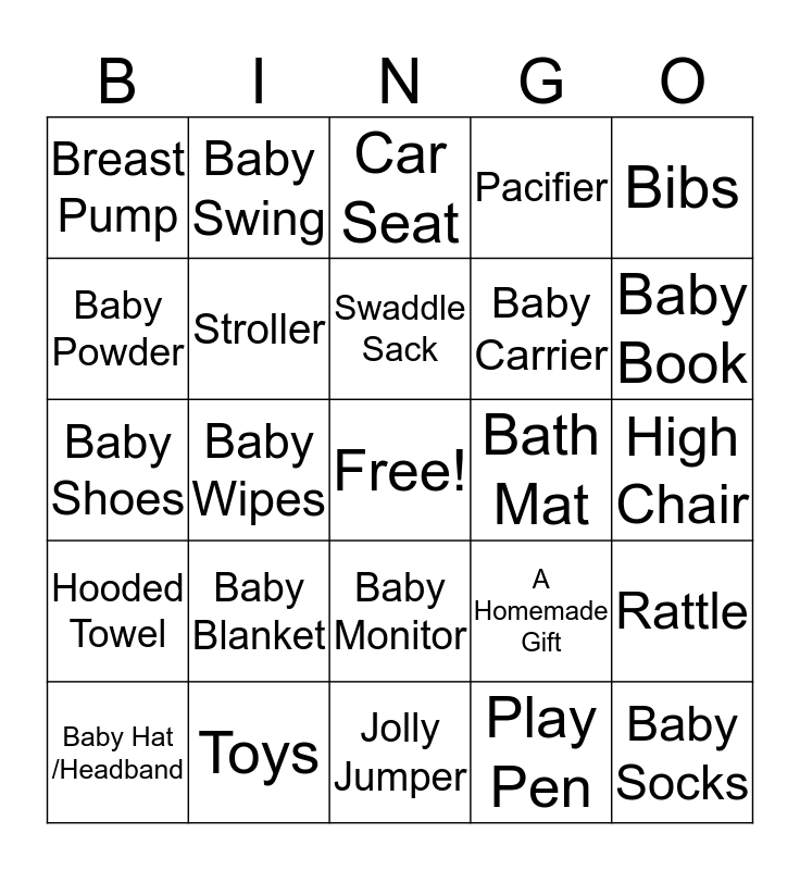 This bingo card has a free space and 34 words: Diapers, Play Pen, Bottle, Nursing Cushion, Hooded Towel, Stroller, Bibs, Baby Hat /Headband, Baby Swing, Baby Wipes, Swaddle Sack, Car Seat, Baby Powder, Stuffed Animal, Bath Mat, Baby Book, Toys, Baby Shoes, Baby Blanket, A Homemade Gift, Baby Monitor, Baby Gym/ Exerciser, Breast Pump, High Chair, Jolly Jumper, Baby Socks, Pacifier, Diaper Bag, Baby Carrier, Baby Powder, Baby Shampoo, Baby Wipes, Rattle and Onesie.