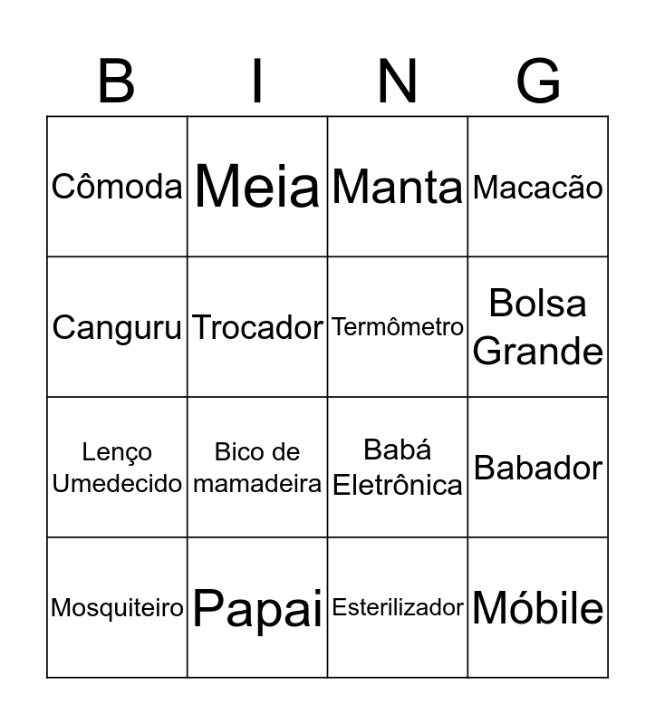 This bingo card has 54 words: Joaquim, Papai, Mamãe, Pediatra, Abajur, Almofada de amamentação, Babá Eletrônica, Kit Higiene, Cômoda, Enfeite de Porta, Manta, Naninha, Fralda de boca, Fralda P, Fralda M, Móbile, Mosquiteiro, Trocador, Berço, Babador, Body manga longa, Body manga curta, Mijão, Macacão, Luva, Meia, Touca, Sapatinho, Banheira, Cotonete, Creme, Sabonete, Shampoo, Talco, Termômetro, Pente, Lenço Umedecido, Toalha de banho, Bebê conforto, Bolsa Grande, Bolsa média, Bolsa pequena, Brinquedo para carrinho, Carrinho, Lençol, Travesseiro, Chupeta, Aspirador Nasal, Canguru, Bico de mamadeira, Esterilizador, Mordedor, Tapete and Kit manicure.