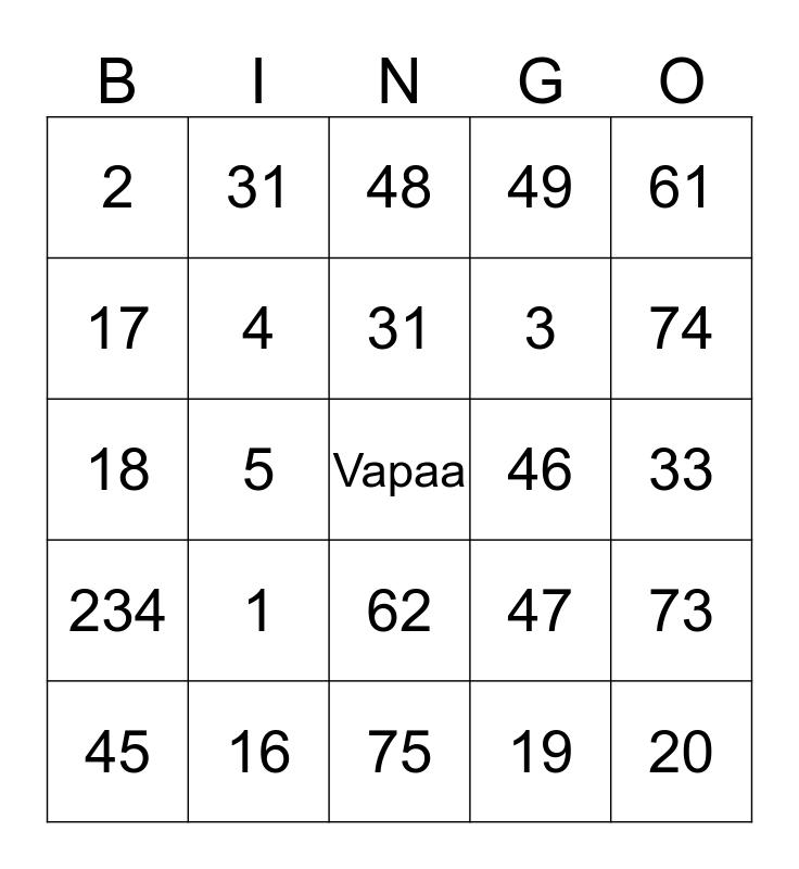 This bingo card has a free space and 24 words: 1, 16, 31, 45, 61, 2, 17, 31, 46, 62, 3, 18, 47, 73, 4, 19, 33, 48, 74, 5, 20, 234, 49 and 75.