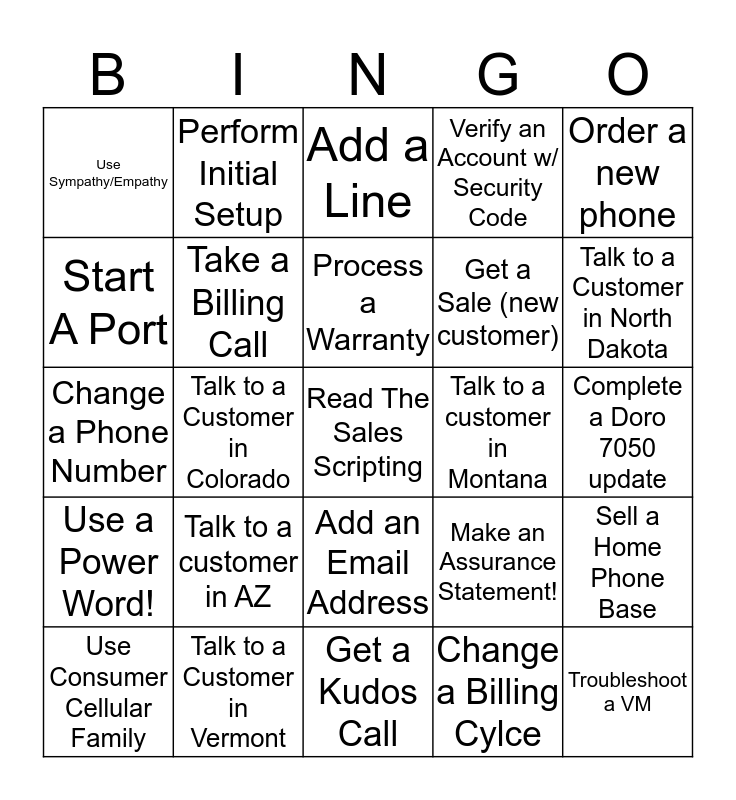 This bingo card has 25 words: Talk to a customer in AZ, Get a Kudos Call, Process a Warranty, Use Consumer Cellular Family, Order a new phone, Use Sympathy/Empathy, Start A Port, Perform Initial Setup, Talk to a customer in Montana, Add an Email Address, Get a Sale (new customer), Change a Phone Number, Make an Assurance Statement!, Sell a Home Phone Base, Take a Billing Call, Troubleshoot a VM, Complete a Doro 7050 update, Add a Line, Talk to a Customer in North Dakota, Talk to a Customer in Colorado, Read The Sales Scripting, Talk to a Customer in Vermont, Use a Power Word!, Verify an Account w/ Security Code and Change a Billing Cylce.