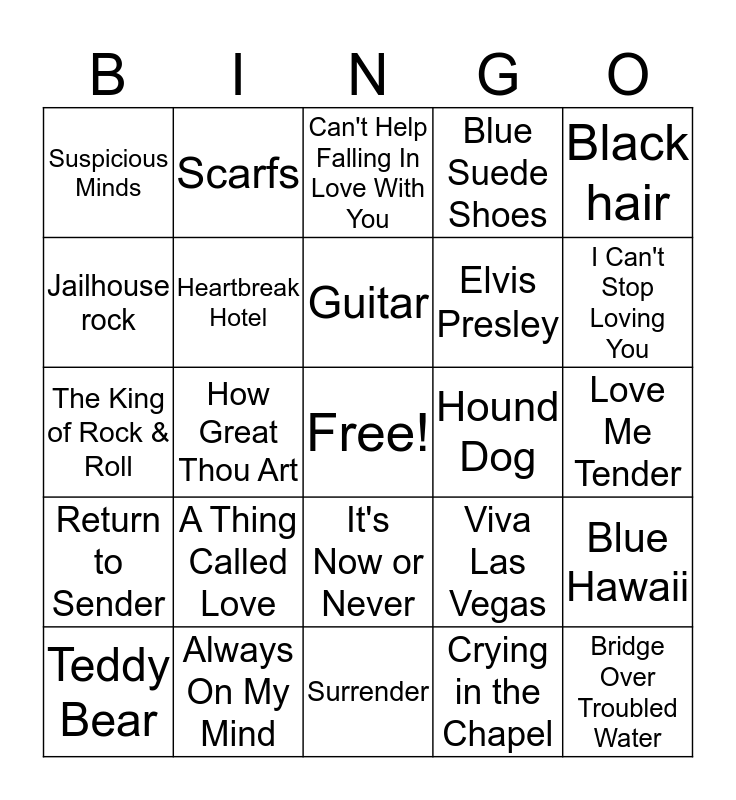 This bingo card has a free space and 29 words: Teddy Bear, Release Me, How Great Thou Art, Snowbird, Suspicious Minds, Can't Help Falling In Love With You, Heartbreak Hotel, A Thing Called Love, Hound Dog, Always On My Mind, Love Me Tender, Bridge Over Troubled Water, Surrender, Crying in the Chapel, I Can't Stop Loving You, Kentucky Rain, It's Now or Never, Return to Sender, Black hair, The King of Rock & Roll, Viva Las Vegas, White Jumpsuit, Elvis Presley, Jailhouse rock, Blue Suede Shoes, Scarfs, Blue Hawaii, Guitar and Graceland.