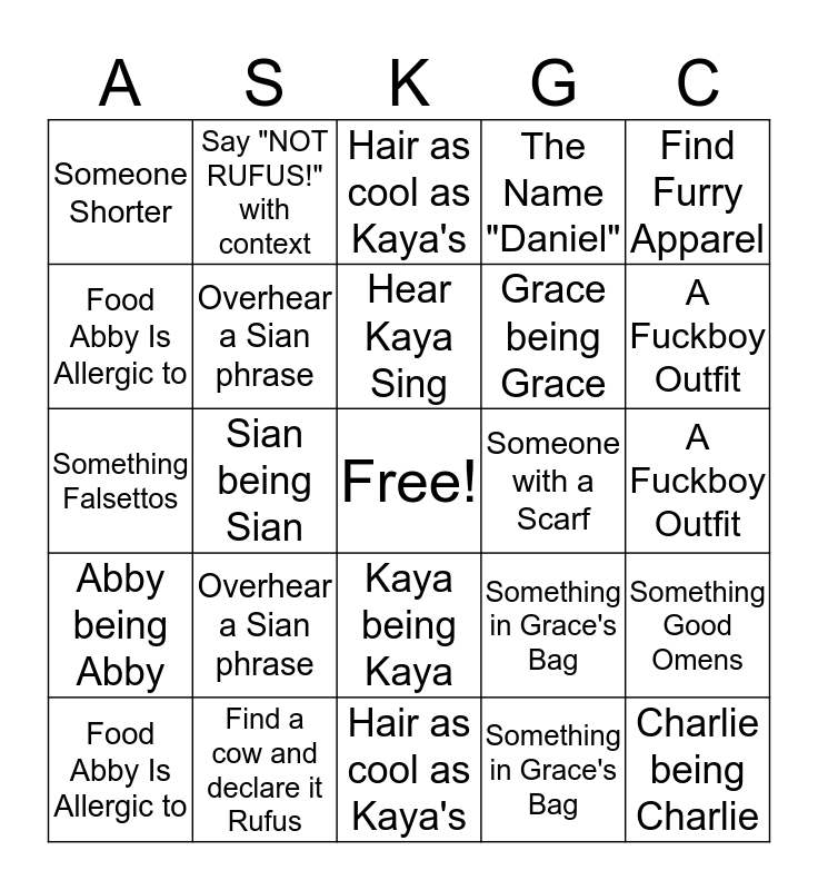 This bingo card has a free space and 24 words: Food Abby Is Allergic to, Overhear a Sian phrase, Hear Kaya Sing, Something in Grace's Bag, Find Furry Apparel, Someone Shorter, Say "NOT RUFUS!" with context, Hair as cool as Kaya's, Someone with a Scarf, A Fuckboy Outfit, Something Falsettos, Overhear a Sian phrase, Something in Grace's Bag, Something Good Omens, Food Abby Is Allergic to, Find a cow and declare it Rufus, Hair as cool as Kaya's, The Name "Daniel", A Fuckboy Outfit, Abby being Abby, Sian being Sian, Kaya being Kaya, Grace being Grace and Charlie being Charlie.