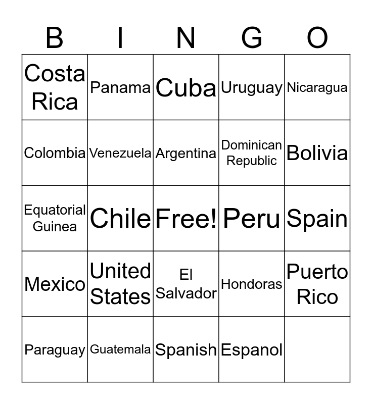This bingo card has a free space and 24 words: Mexico, Guatemala, El Salvador, Hondoras, Nicaragua, Costa Rica, Panama, Cuba, Dominican Republic, Puerto Rico, Colombia, Venezuela, Ecuador, Peru, Bolivia, Paraguay, Chile, Argentina, Uruguay, Spain, Equatorial Guinea, United States, Spanish and Espanol.