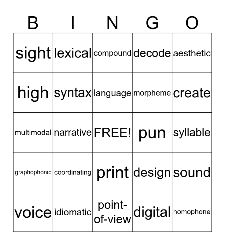 This bingo card has a free space and 106 words: adverb, adverbial, aesthetic, alliteration, apposition, appreciation, audience, author, angle, camera, clause, cohesion, collocation, colon, sentence, complex, compound, comprehension, strategies, concepts, print, conjunction, connective, context, convention, coordinating, create, decode, dependent, clause, design, digital, digraph, eliterature, ellipsis, etymological, knowledge, evaluative, language, figurative, framing, genre, grammar, graphophonic, handwriting, high, frequency, sight, words, homophone, hybrid, idiomatic, expressions, independent, intertextuality, juxtaposition, features, patterns, layout, lexical, cohesion, listen, media, medium, metalanguage, metonymy, verb, modality, morpheme, multimodal, narrative, point-of-view, neologism, nominalisation, noun, onset, rime, personification, phoneme, phonic, awareness, phrase, poetic, prediction, prefix, prepositional, pun, return, sweep, rhetorical, question, salience, scanning, semantic, semicolon, sound, spoonerism, subject, suffix, syllable, syntax, tense, theme, verb, voice and write.