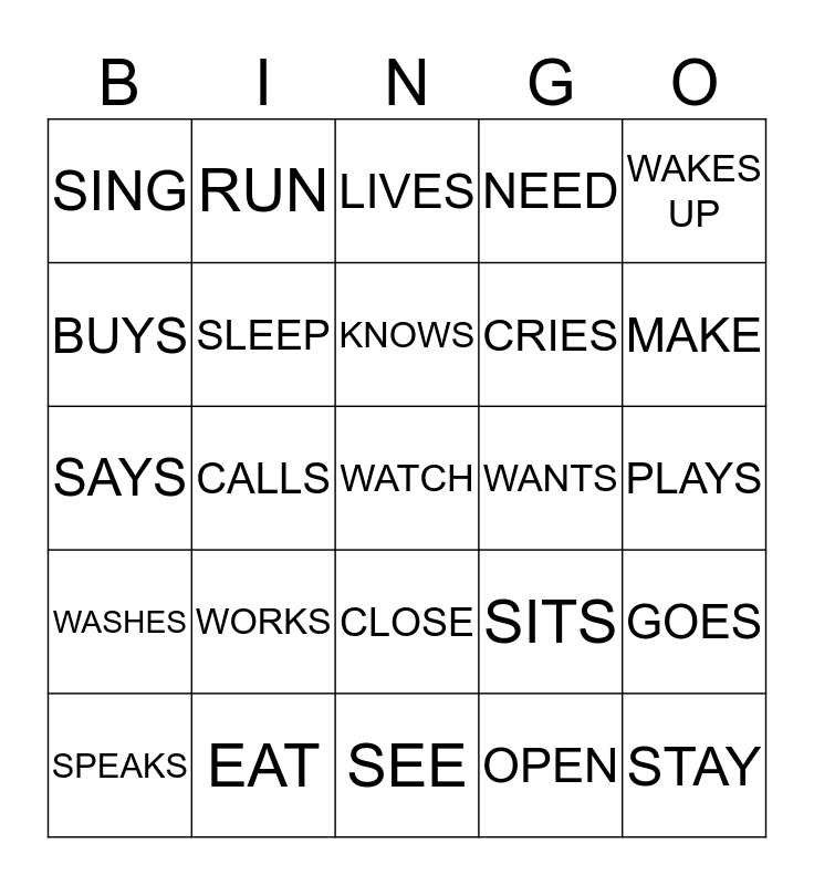 This bingo card has 40 words: LIKES, SAYS, NEED, SLEEP, EAT, CLOSE, KNOWS, STUDIES, WAKES UP, WASHES, CALLS, NEED, WATCH, PLAYS, WANTS, WORKS, SELL, SING, DRINKS, LIVES, GOES, OPEN, CRIES, BUYS, START, PRAYS, REPLY, FLY, STAY, ENJOY, WALK, SPEAKS, GIVES, SITS, MAKE, SEE, FEELS, TELL, RUN and TEACHES.