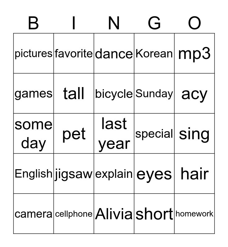 This bingo card has a free space and 24 words: jigsaw, cellphone, bicycle, camera, mp3, pictures, games, favorite, special, explain, Sunday, some day, eyes, hair, tall, short, sing, dance, acy, pet, homework, English, Korean and Alivia.