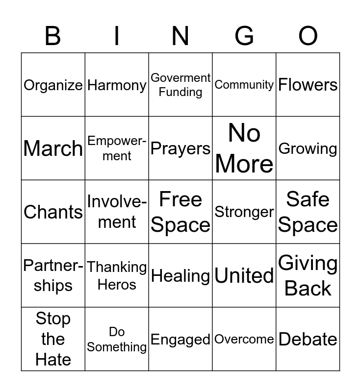 This bingo card has a free space and 24 words: Thanking Heros, Do Something, Prayers, Stop the Hate, Flowers, Organize, March, Harmony, Stronger, Healing, No More, Chants, United, Giving Back, Empower- ment, Overcome, Safe Space, Goverment Funding, Growing, Involve-ment, Debate, Partner-ships, Community and Engaged.