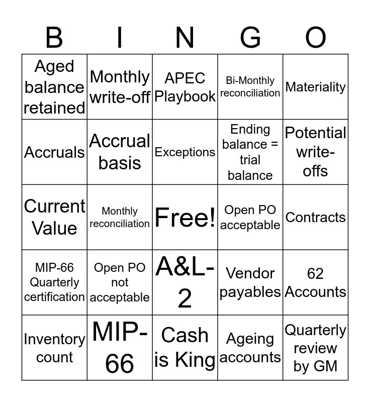 This bingo card has a free space and 41 words: Past periods, Current Value, Future financial viability, Accrual basis, MIP-66, A&L-2, Exceptions, Potential exposure, Materiality, MIP-66 Quarterly certification, Monthly reconciliation, Bi-Monthly reconciliation, Quarterly review by GM, Contracts, Open PO acceptable, Open PO not acceptable, No aged balance retained, Aged balance retained, Supporting documents, APEC Playbook, 62 Accounts, Self-explanatory, Cash is King, Ending balance = trial balance, Clearing accounts = 0, Wages advances are current, Ageing accounts, CC receivables reconciled, Potential write-offs, Prepaid expense, Amortization schedule, Monthly write-off, Inventory count, Days on hand, Vendor payables, Accruals, Vacation due, Bonus accruals, FF&E Liability, Capital expenditures and Management Agreement.