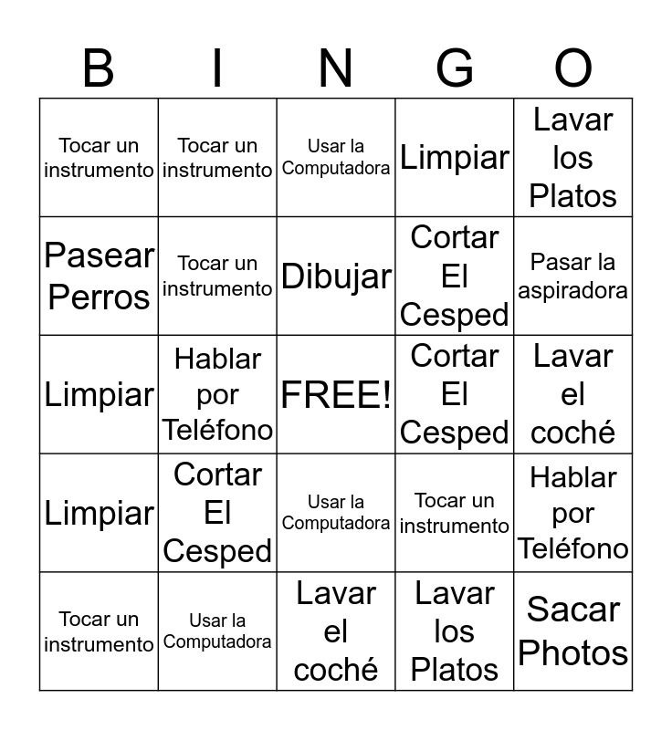 ⚠ This card has duplicate items: Cortar El Cesped (3), Usar la Computadora (3), Tocar un instrumento (5), Lavar los Platos (2), Limpiar (3), Hablar por Teléfono (2), Lavar el coché (2)