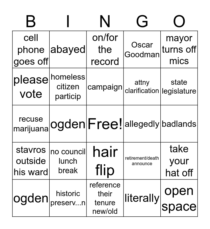 This bingo card has a free space and 24 words: no council lunch break, historic preserv...n, campaign, ogden, mayor turns off mics, cell phone goes off, please vote, abayed, allegedly, hair flip, attny clarification, recuse marijuana, retirement/death announce, take your hat off, homeless citizen particip, literally, badlands, on/for the record, state legislature, ogden, open space, stavros outside his ward, Oscar Goodman and reference their tenure new/old.