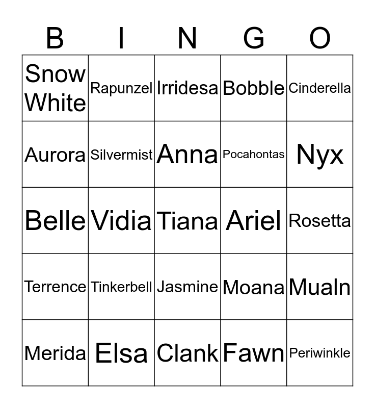 This bingo card has a free space and 24 words: Tinkerbell, Elsa, Anna, Merida, Cinderella, Snow White, Aurora, Rapunzel, Ariel, Jasmine, Pocahontas, Belle, Moana, Mualn, Silvermist, Fawn, Rosetta, Irridesa, Nyx, Vidia, Periwinkle, Terrence, Bobble and Clank.