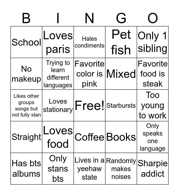 This bingo card has a free space and 24 words: Loves food, Only stans bts, Favorite color is pink, Has bts albums, Only 1 sibling, School, No makeup, Loves paris, Starbursts, Coffee, Mixed, Likes other groups songs but not fully stan, Books, Only speaks one language, Trying to learn different languages, Randomly makes noises, Too young to work, Hates condiments, Favorite food is steak, Loves stationary, Sharpie addict, Straight, Pet fish and Lives in a yeehaw state.