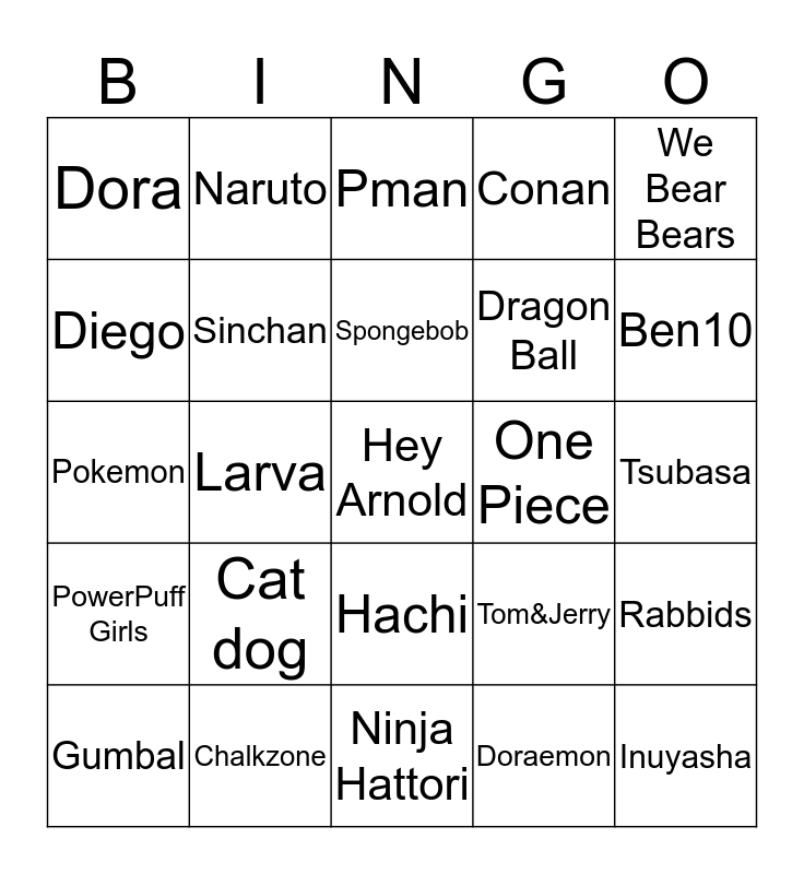 This bingo card has a free space and 24 words: Cat dog, Chalkzone, Spongebob, Gumbal, We Bear Bears, Dora, Diego, Naruto, One Piece, Hachi, Dragon Ball, Pokemon, Tom&Jerry, Rabbids, Sinchan, Doraemon, Tsubasa, Pman, Ben10, Larva, Inuyasha, PowerPuff Girls, Conan and Ninja Hattori.