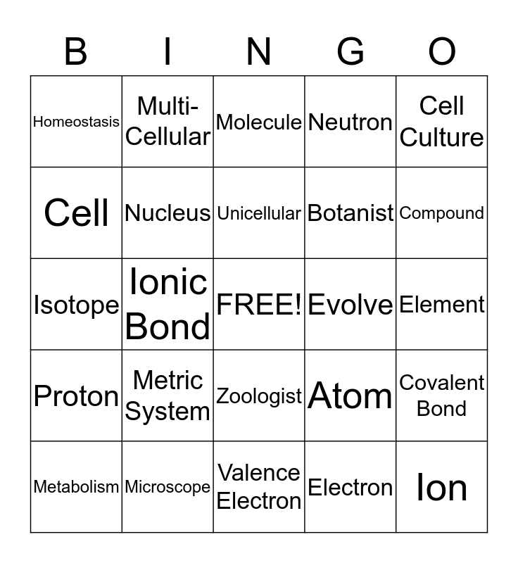 This bingo card has a free space and 24 words: Metric System, Microscope, Unicellular, Metabolism, Cell Culture, Homeostasis, Cell, Multi- Cellular, Evolve, Zoologist, Botanist, Isotope, Atom, Covalent Bond, Nucleus, Electron, Element, Molecule, Compound, Ionic Bond, Ion, Proton, Neutron and Valence Electron.